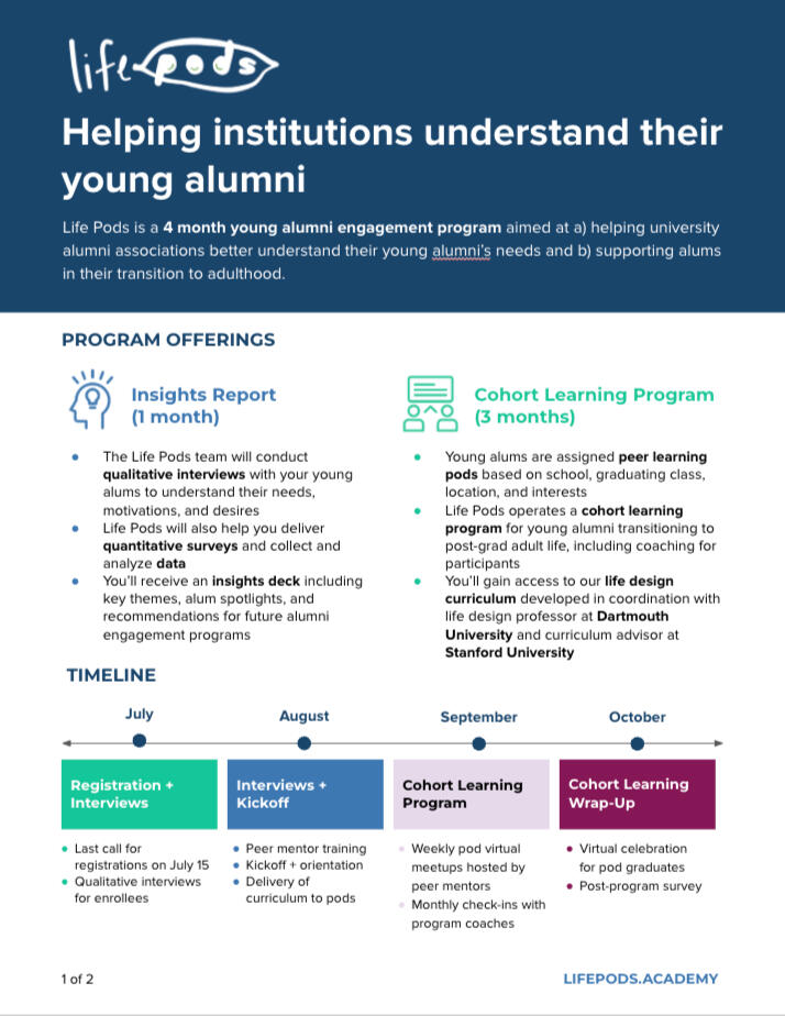 “Life Pods is on to something. My team has been looking at ways to provide value and better engage young alumni immediately after graduation for the entirety of my 10 years working at Duke. This is the missing piece to set up Duke alumni for success.”